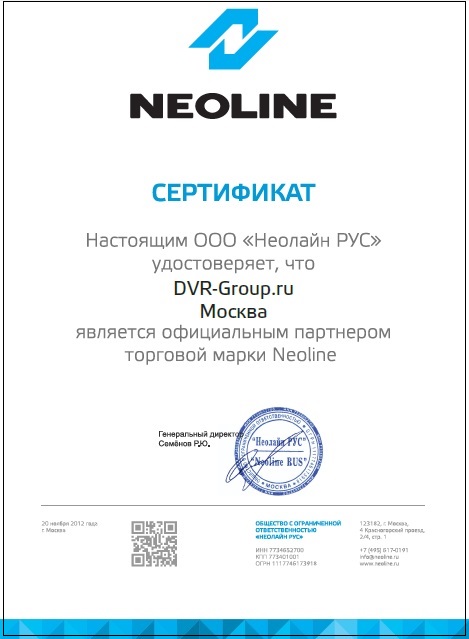 Обращаем Ваше внимание, что при покупке в нашем магазине на все видеорегистраторы Neoline мы можем предоставить сертификат о соответствии EAC («Eurasian Conformity», «Евразийское соответствие») – это единый знак обращения товаров, который свидетельствует, что продукция прошла и удовлетворяет все принятые технические регламенты на территории Таможенного союза ЕврАзЭС. Данный сертификат может быть предъявлен сотруднику ГИБДД в случае ДТП для приобщения видеозаписи к материалам происшествия. Убедительная просьба, сделать запрос у менеджера при оформлении заказа. Без соответствующей просьбы сертификат не предоставляется.