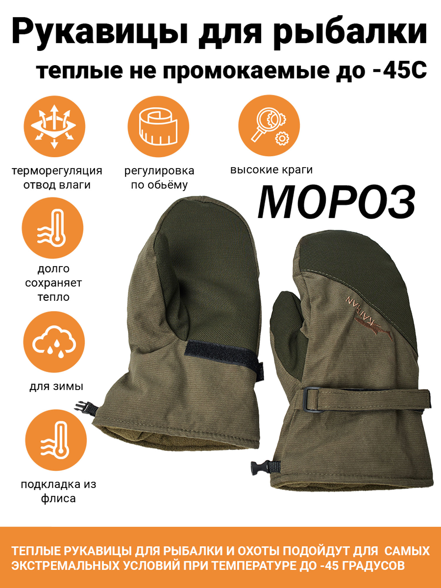Рукавицы для рыбаков и охотников KATRAN МОРОЗ разработаны специально для любителей рыбалки и охоты. Конструкция варежек позволит вам одним движением сбросить их с рук, и вам не нужно тратить время на снимание перчаток во время поклёвки. Верх рукавиц выполнен из мембранной ткани, а в качестве подкладки используется теплый и приятный флис. В качестве утеплителя используется AirFIBRE, который прекрасно защитит вас от холода и не будет мешать теплообмену.