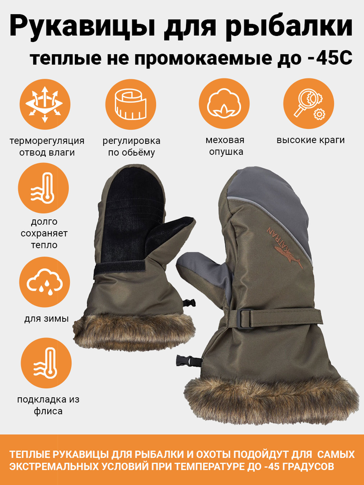 Рукавицы для рыбаков и охотников KATRAN ВИХРЬ разработаны специально для любителей рыбалки и охоты. Температура эксплуатации до -45С. Конструкция варежек позволит вам одним движением сбросить их с рук, и вам не нужно тратить время на снимание перчаток во время поклёвки. Верх рукавиц выполнен из мембранной ткани таслан, а в качестве подкладки используется теплый и приятный флис. В качестве утеплителя используется AirFIBRE, который прекрасно защитит вас от холода и не будет мешать теплообмену.